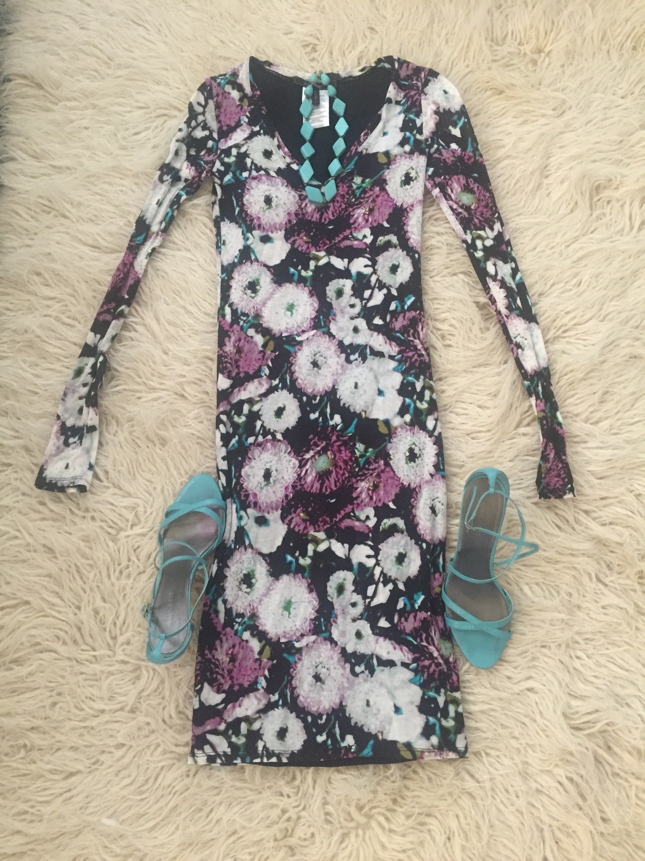 Outfit #4: BCBG dress, ($9.99) Ninewest turquoise heels ($5.99) and turquoise necklace (my own)