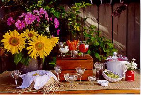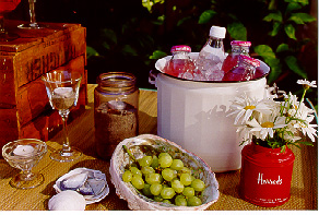 Incorporate odd items to decorate a tabletop like no other. I set this "beachy" hors d'oeuvre table with a few unexpected items from Thrift Town along with a few of my own secondhand items. (For this tabletop old buckets were used to serve drinks on ice, and to hold flowers. An assortment of wine and martini glasses were used for veggies & dip and were also used to hold sand and votive candles. A straw hat was used as a chip bowl, a shell to serve grapes, and a beach mat as a tablecloth.) .