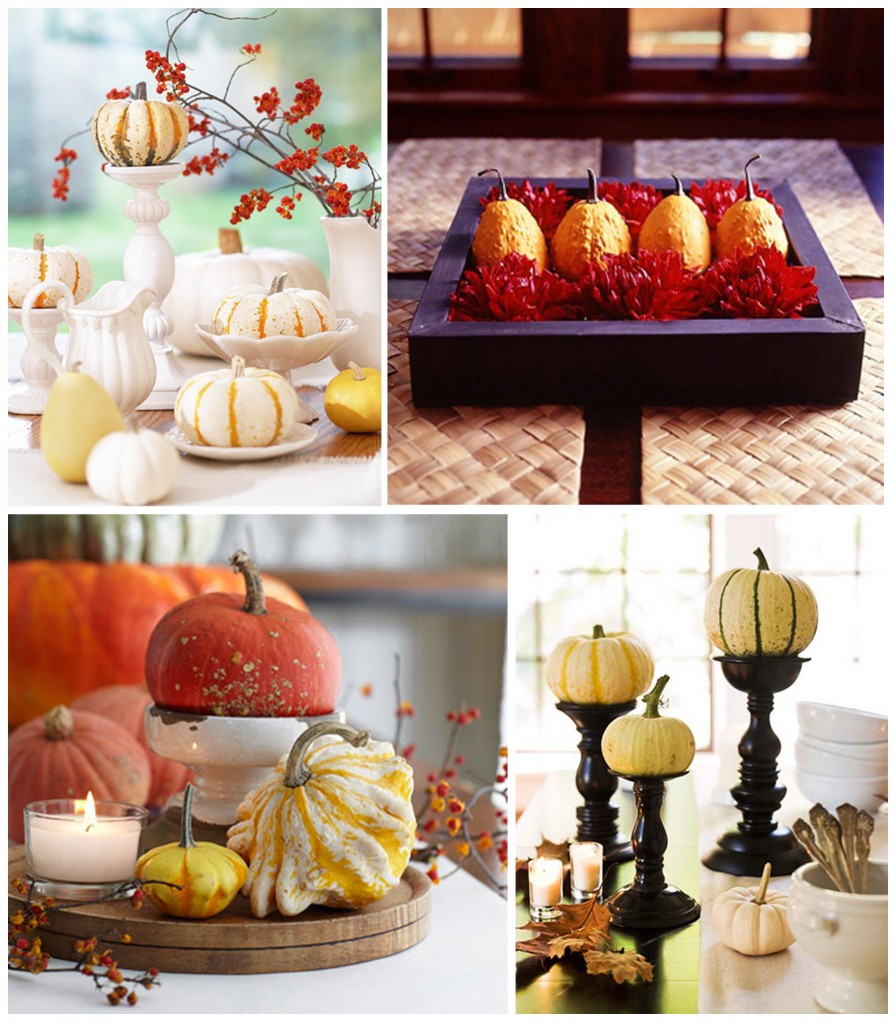 - (L-R) Mix & match thrifted white dishware and add a pop of fall color with the pumpkins & gourds. Dishes with ridges complement the natural elements in the display.